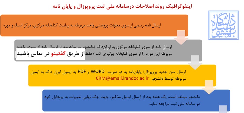 چنانچه بعد از دفاع از پروپوزال خود و ثبت آن در سامانه ملی ثبت پروپوزال و پایان نامه/ رساله، عنوان پایان‌نامه دانشجو دچار تغیر شود (تغییر جزئی یا کلی)، یا اساتید راهنما و مشاور پایان‌نامه مورد نظر تغییر یابد (افزوده شدن، کاسته شدن، جایگزین شدن)، دانشجو موظف است این تغییرات به اطلاع معاونت پژوهشی دانشکده/پژوهشکده خود برساند تا مراحل انجام اصلاحات در سامانه ملی ثبت از سوی ایران‌داک انجام گیرد.