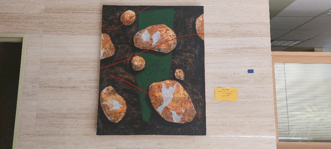 • بر دیوارهای کتابخانه مرکزی آثار هنری دانش‌آموختگان در رشته هنر نصب شده بود. این آثار برای دفاع از پایان‌نامه/ رساله تهیه شده بود و شناسنامه اثر نیز در کنار آن دیده می‌شد.