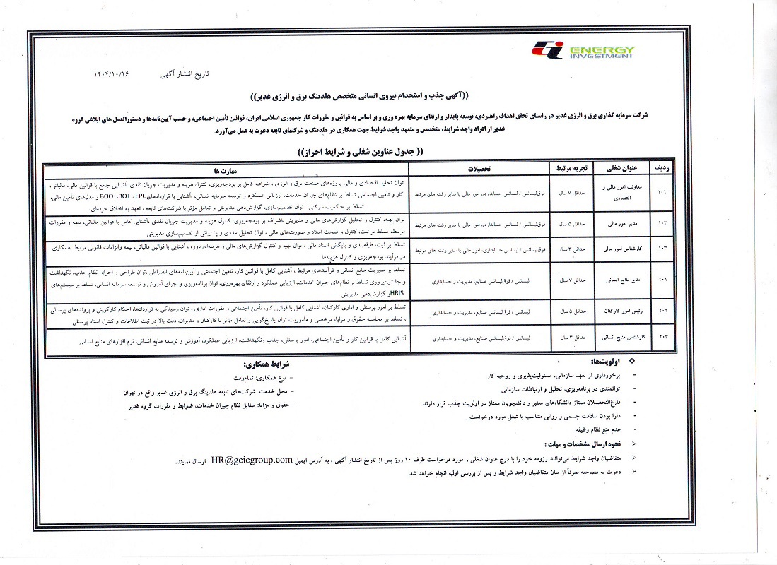 فراخوان هلدینگ برق و انرژی غدیر برای جذب دانشجویان و فارغالتحصیلان دانشگاهی