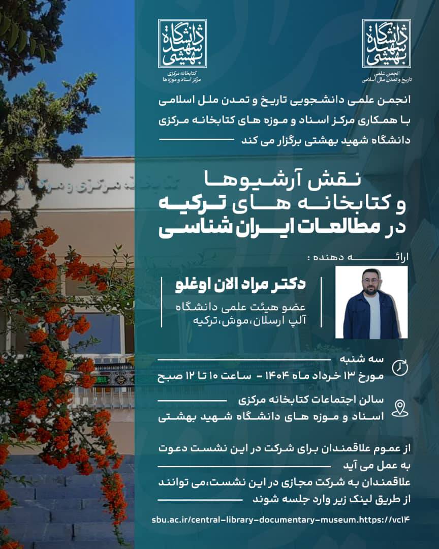 انجمن علمی دانشجویی تاریخ و تمدن ملل اسلامی با همکاری مرکز اسناد و موزههای کتابخانه مرکزی دانشگاه شهید بهشتی برگزر می کند.