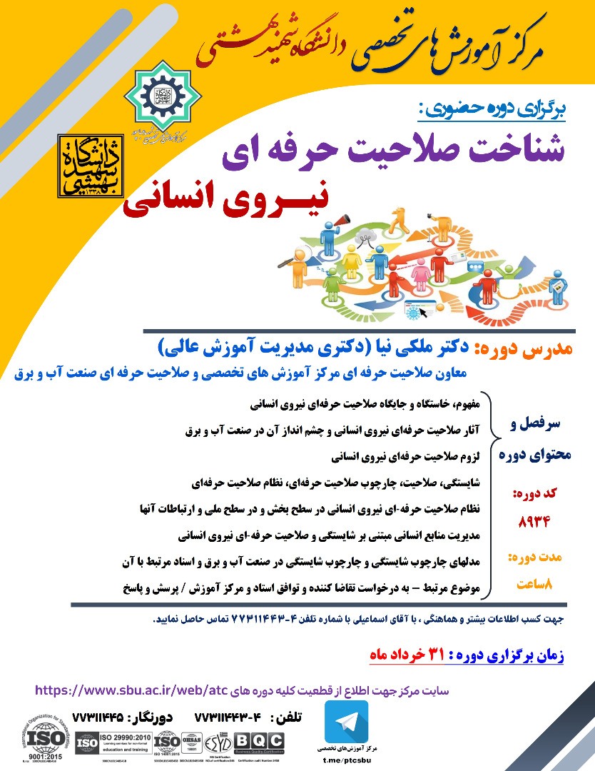 صفحه اصلی 🔺دوره آموزشی شناخت صلاحیت حرفه ای نیروی انسانی🔻 3038 بازدید print share مرکز آموزش های تخصصی دانشگاه شهید بهشتی برگزار میکند دوره آموزشی شناخت صلاحیت حرفه ای نیروی انسانی با توجه به...